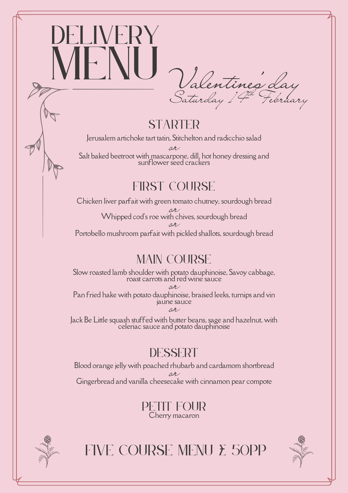 Zoe will be presenting a special five course delivery menu, available only on Saturday 14th February. Please send her a message to ask any queries or enquire about available delivery time slots.